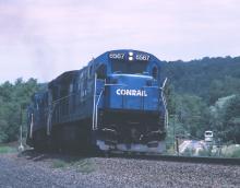 The 6567 and friends battle their way upgrade with SEMB-5 past MP 143 in Hinsdale, MA. on July 16, 1988.