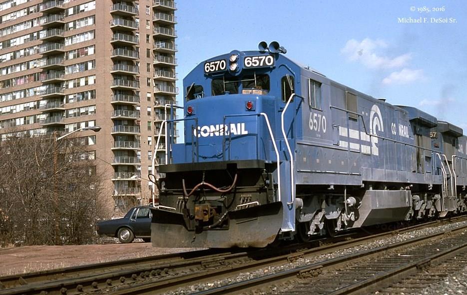 Conrail C-30-7A #6570 leads a westbound past the "high rise" Newark, NJ 3/10/1985