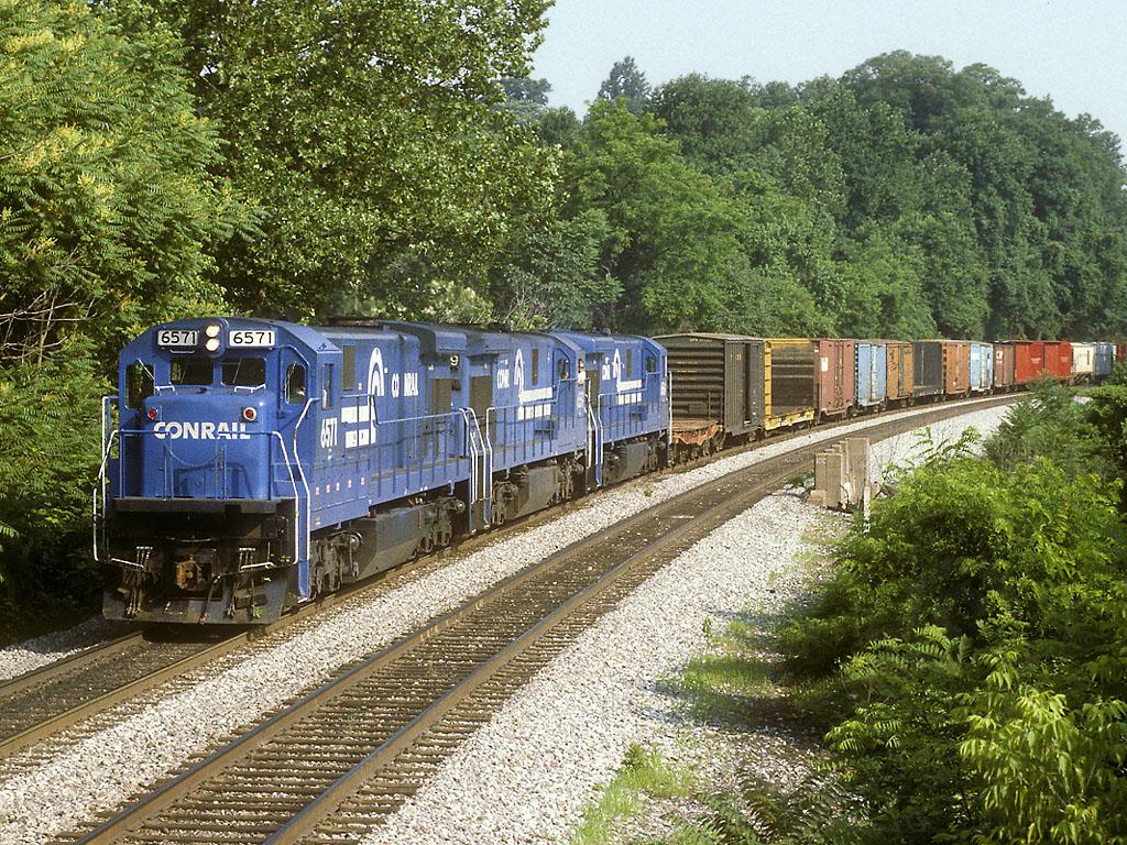 Conrail C30-7a 6571 leads a run-through train to Potomac Yard, symboled Z413 on CSX, through Elkridge MD, on just west of Baltimore.