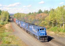 Conrail C30-7A 6571 and three other GE units are eastbound at Hinsdale, MA on the Boston Line at 1505 hrs on 5 October 1990.