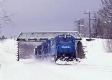C30-7A 6573 leads eastbound SEMB beneath the Bullard's Crossing pony truss just west of the summit in Hinsdale, MA. on Jan. 26, 1988. Unfortunately, this well-known landmark and photo prop was removed about 5 years ago.