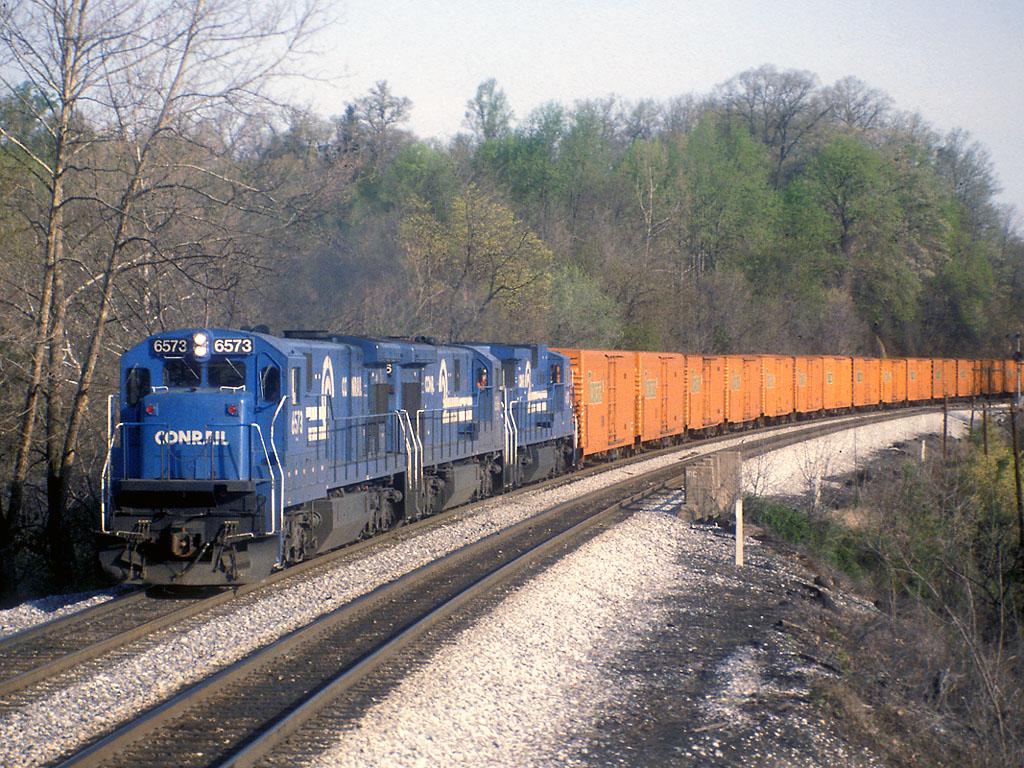 A trio of GEs heads south through Elkridge MD on its way to Potomac Yard in Alexandria VA. This train travels on CSX's rails south of Philadelphia to avoid the Northeast Corridor. The Tropicana cars on the head end are being taken south to be loaded and made back into the northbound Juice train.