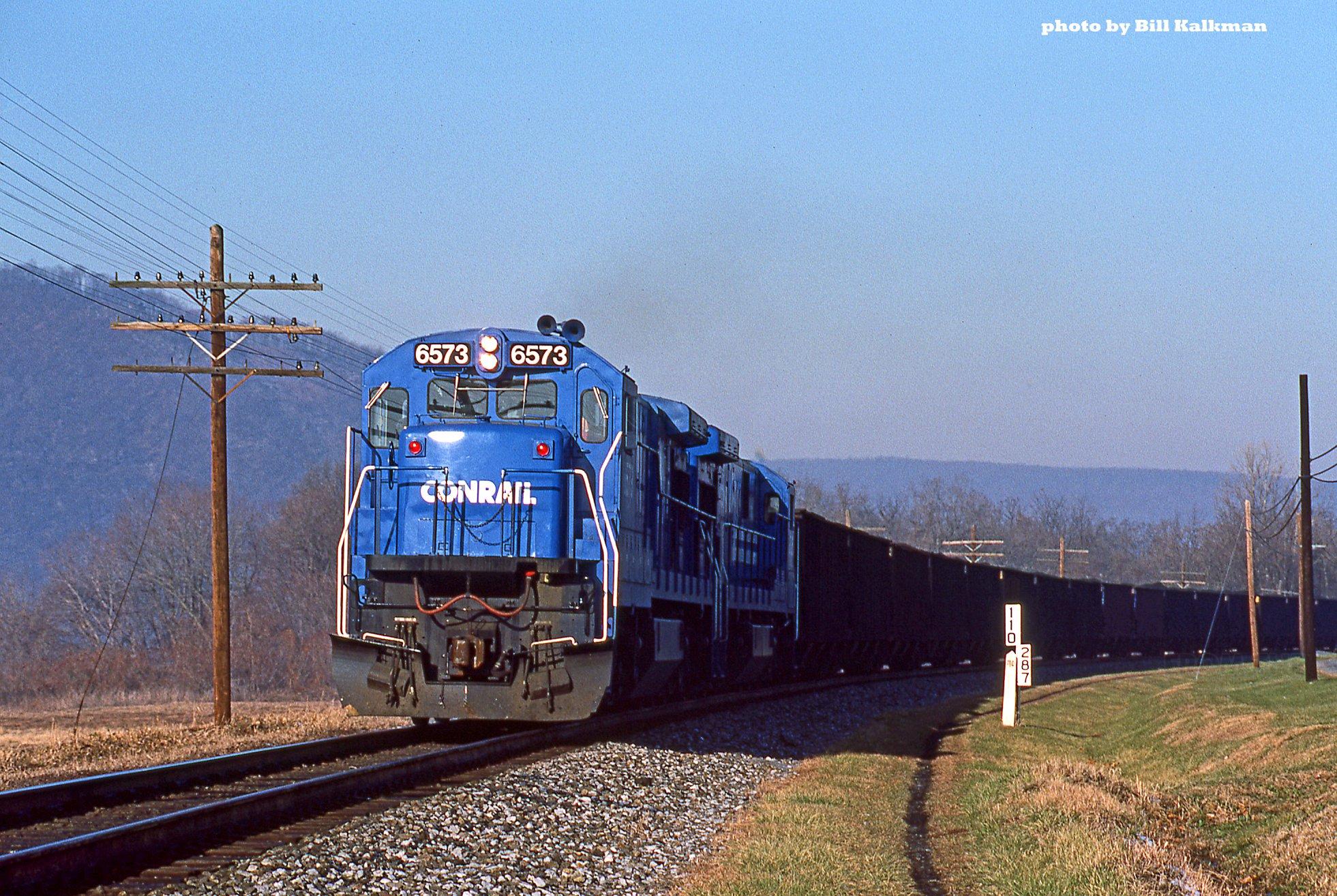 C30-7A 6573 is on the point of S/B BUEN-8 (Buffalo, NY to Enola, PA of the 8th). Its on the Buffalo Line, next to PA Rt. 147. Is it Mile Post 110 or is it 287? Depending on how you look at it, its both. Its 110 miles from Baltimore, when it was the Northern Central to Sunbury, and 287 miles from Buffalo. 9:30AM on 12-9-84 in Halifax, PA.