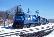 NHSE, led by the 6576, switching at North Adams Jct. in Pittsfield, MA. on Feb. 22, 1986.