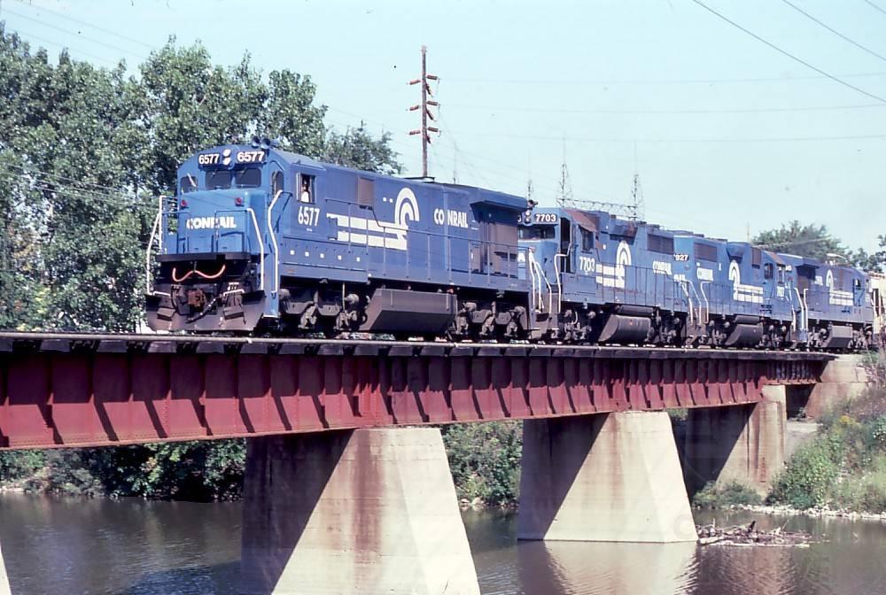 A Conrail ELIN-4A crosses the Mississinewa River at Marion, IN with CR 6577, a new C30-7A, on the point on Sept. 4, 1984. Kevin Nelson photo with permission.