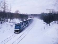 CR 6581 leads TV6 approaching the MASS Rt. 8 overhead bridge in Hinsdale, MA. on Jan. 24, 1987.