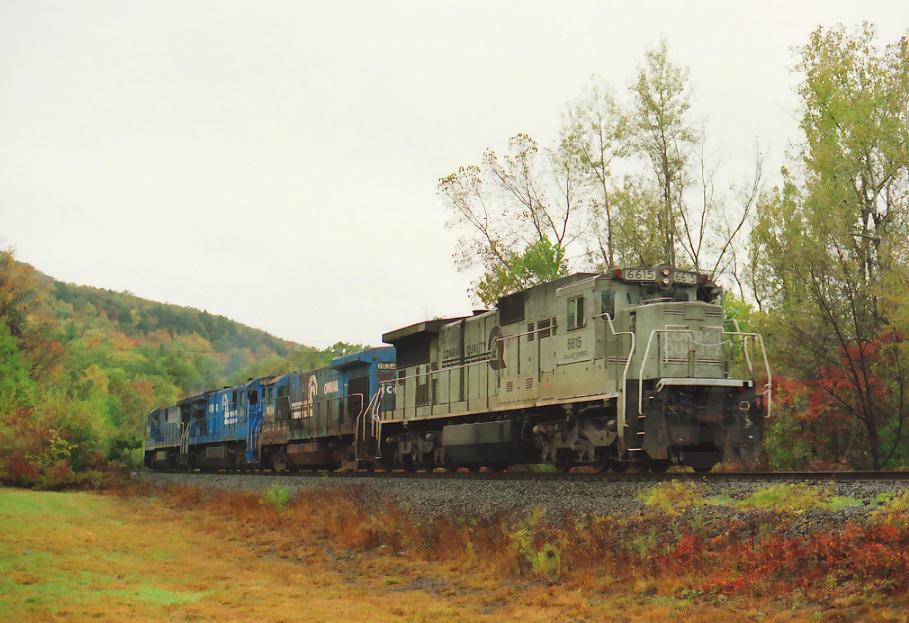 Damaged C32-8 6615, note missing coupler and plow, brings up the rear of SHP301 near MP 121 in Huntington, MA. on Oct. 10, 1998.