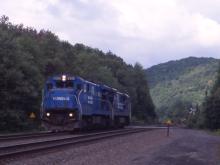 CR 6588 leads part of BOSE's power back to their train after assisting a TV9X at Ballou's on Aug. 30, 1997.