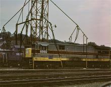 Previous Next At the Conway engine facility late in the day in August, 1977, CR U36C 6592 (ex-EL 3321) waits for assignment alongside SD45-2 6657 (ex-EL 3672). Photo By Alan Page Year 1977 Original Date 8/8/77 Location City Conway PA Location Details Conway engine terminal Equipment Type GE U36C Conrail Number 6592 6657 Predecessor Paint Scheme EL Collection CRHS Conrail Photo Archive Contributions