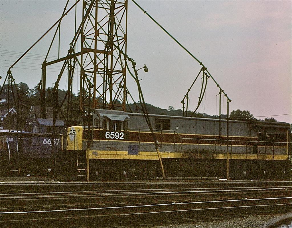 At the Conway engine facility late in the day in August, 1977, CR U36C 6592 (ex-EL 3321) waits for assignment alongside SD45-2 6657 (ex-EL 3672).