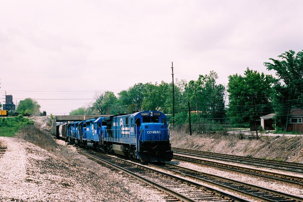 Conrail C30-7A No. 6592 leads an eastbound out of IHB's Blue Island Yard and under the ICG at Highlawn, in June 1986. Doug Davidson photo with permission