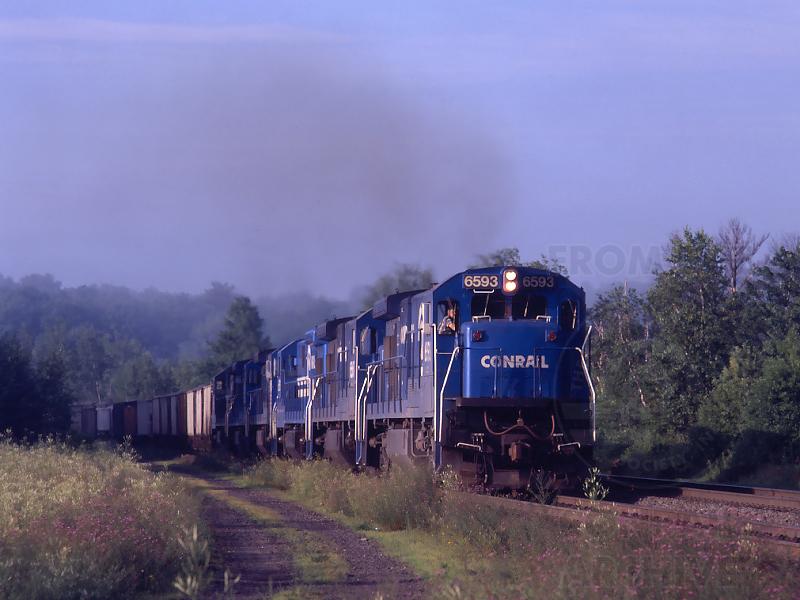 The 6593 and mates muscle westbound ballast train BAL377 near MP 138 in Washington, MA. at 07:11 on July 22, 1990.