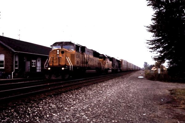 TV80W at MP 67, Brookfield station on Oct. 4, 1991. Following behind the 6599 is MEC 601, one of several GTI/MEC SD40's assigned to CR to work off horsepower hours.