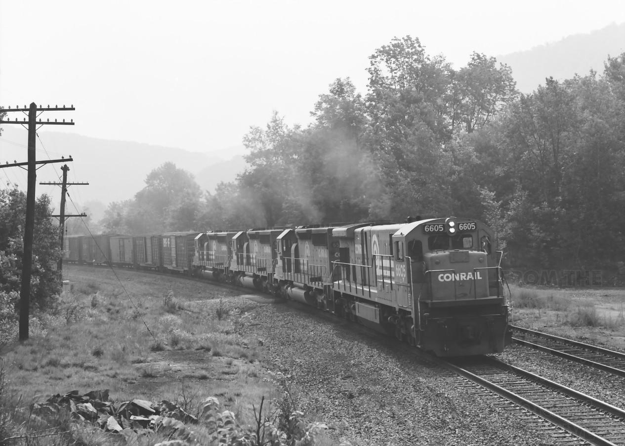 C30-7 6605 leads a trio of SD40-2's on NHSE through Bancroft, MA. on July 16, 1983.