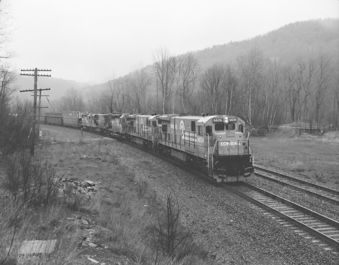 C30-7 6606 leads BOEL through Bancroft, MA. at 09:43 on April 14, 1984.
