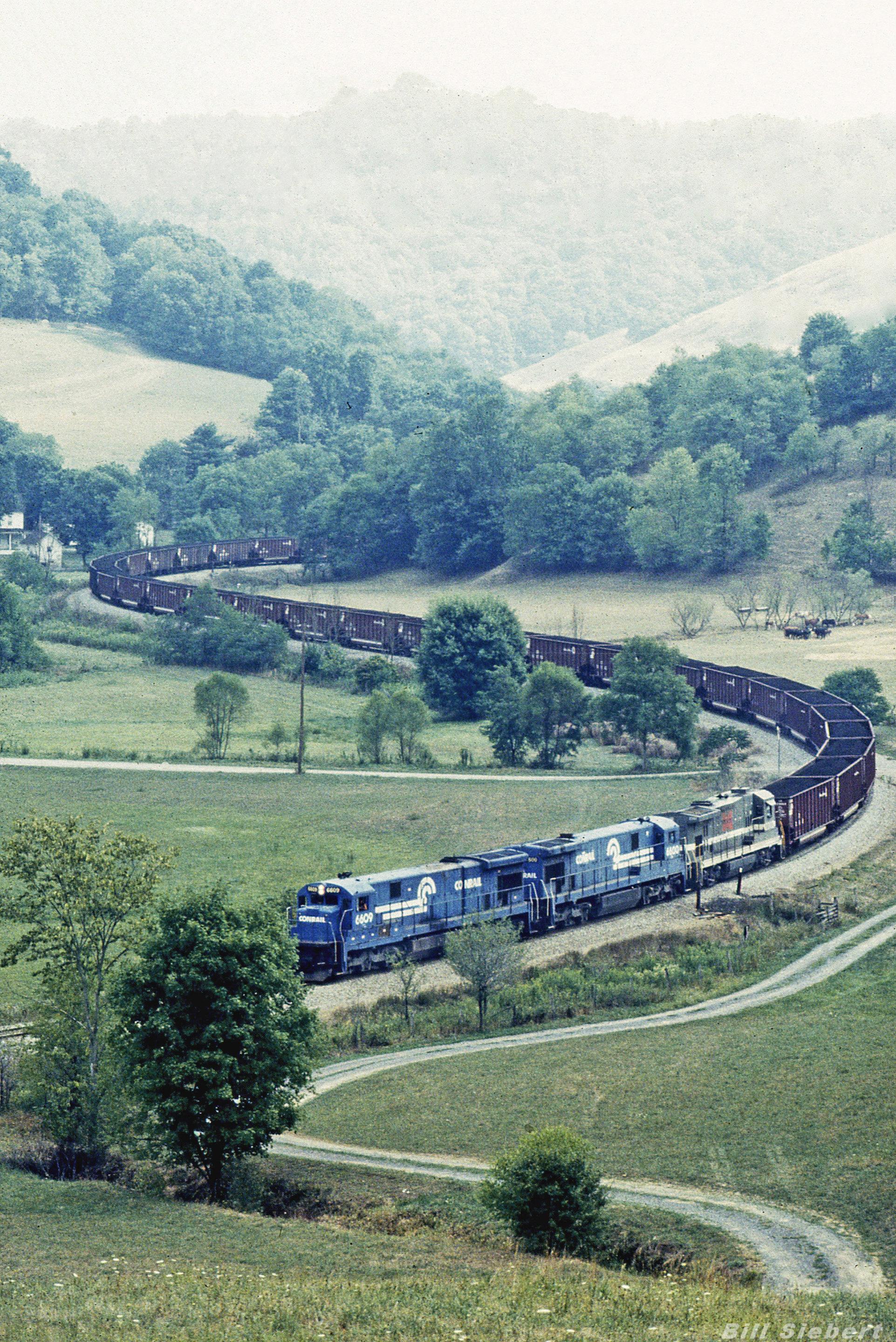 Two of Conrail's C30-7s, 6609 and 6600, and one of Monongahela's "Super-7" locomotives pull a load of coal on a winding Monongahela branchline.