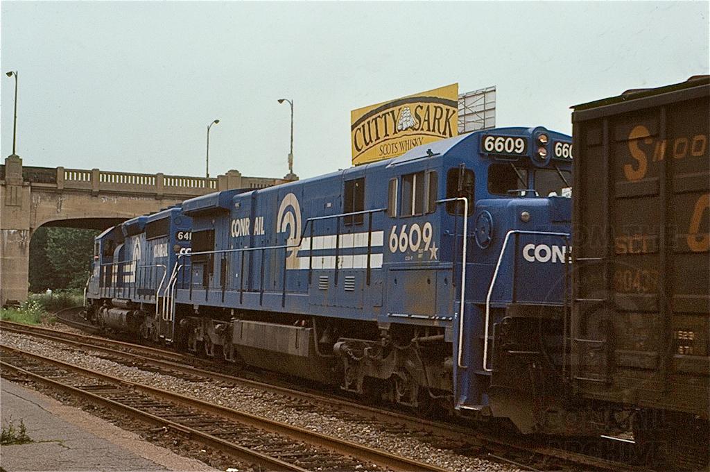 CR C30-7 6609* Test Unit follows SD40-2 6417 through Bethlehem in July, 1978.