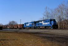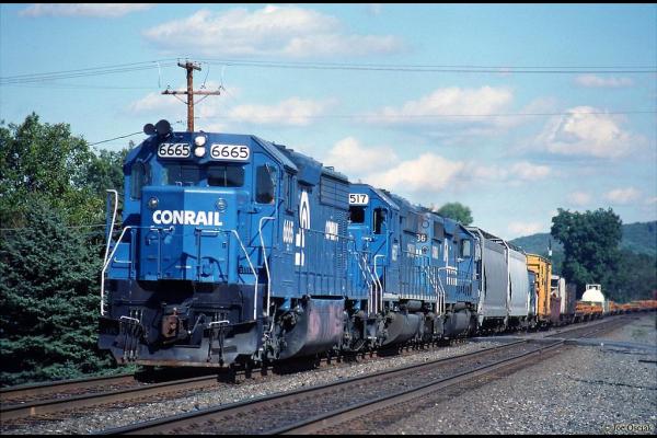 Conrail 6611 is on the point of a coal train to Bethlehem Steel at CP BURN in Allentown, Pa 4/1995.