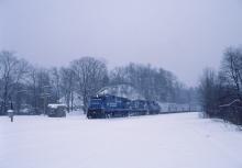 C32-8 6611 leads MBSE through Huntington, MA. on Feb. 12, 1988.