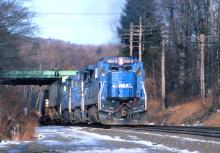 C32-8 6613 leads TV8B over the top at MP 142 in the center of Hinsdale, MA. on Dec. 23, 1984.