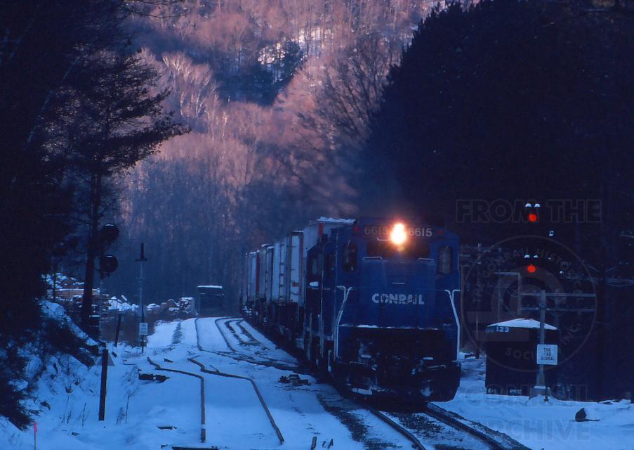 CR 6615 leads TV8B through CP 123 in Chester, MA at 09:04 on Dec. 30, 1987. Note the "End of cab signal" sign at right. The single-tracking of the B&A had only progressed this far at this point in time. The railroad was still double track/ABS west of here, but that would change the following year.