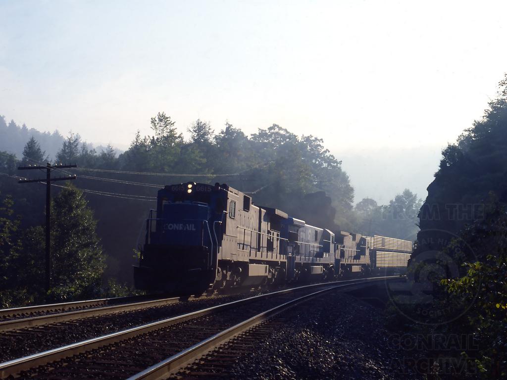 "Camel" 6615 is at the headend of BOEL, (BOston-ELkhart), the only long distance mixed freight to operate on the old Boston & Albany during the ConRail years. The train is leaving Chester and entering Middlefield, MA. as it crosses the west branch of the Westfield River at mile 128.45 on the morning of Sept. 20, 1985.