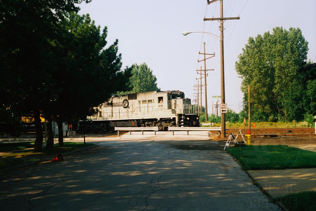 Conrail C32-8 No. 6616 in the Ballast Express paint scheme leads an eastbound coal train at Whiting, in September 1998. Doug Davidson photo with permission