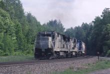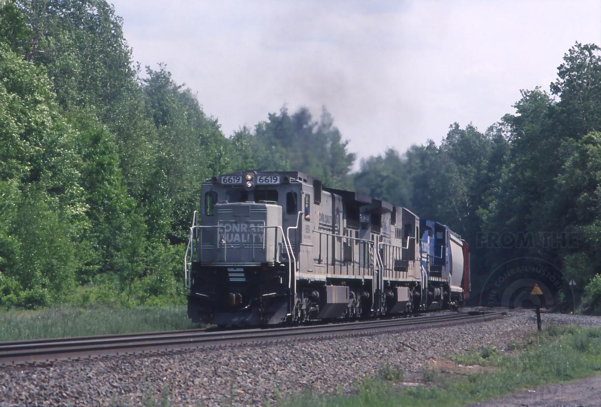 Resplendant in their "Ballast Express" livery, C32-8's 6619 and 6612 lead NESE past Washington depot in Washington, MA. on June 14, 1997.