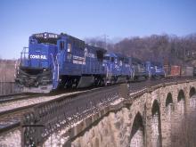 Here C32-8 6619 and three EMDs lead the southbound (westbound) SEPY on CSX's 1833 vintage Thomas Viaduct. This train is lacking the signature empty Tropicana Cars that usually feature heavily in photos of it.