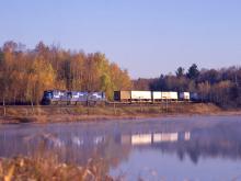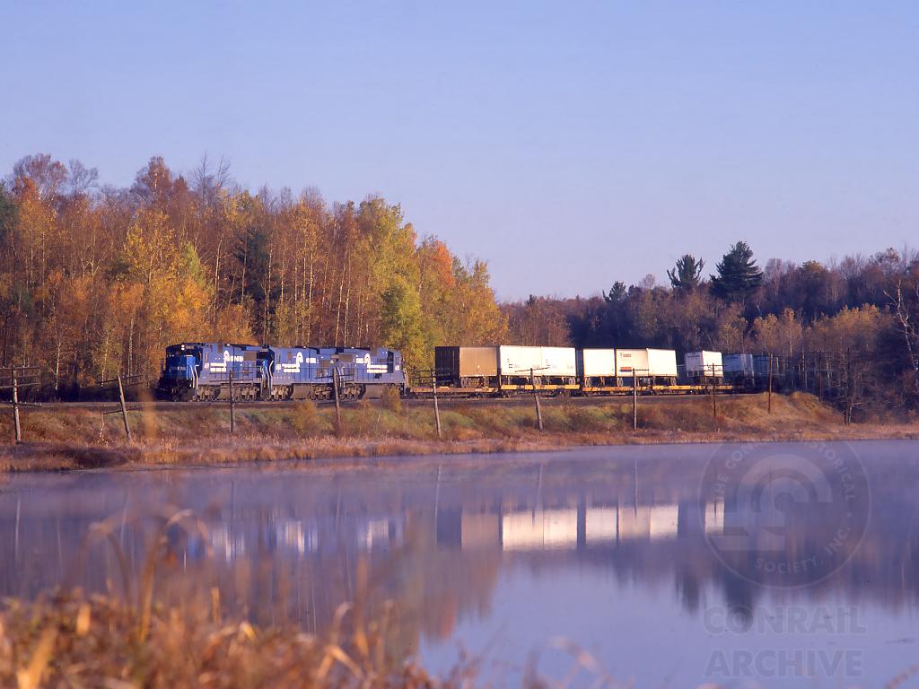 The head end of TV-6 has just crossed the town line from Hinsdale into Washington, MA. as it skirts the north end of Muddy Pond on Oct. 23, 1985. The train itself, is draped across the summit of Washington hill, about a 1/4 mile back.