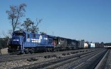 A Conrail westbound is stopped at CP MO to cut off it's helper. C36-7 # 6620 is one of the two C36-7's to carry the "Ballast Express" lettering under the number, 6621 being the other. Neither one would get painted gray as did the ballast express C32's. A pair of Southern Pacific EMD units trail the Conrail GE.