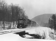 C36-7 6621 with TV6 about to cross Depot Brook near Ballou's in Washington, MA.