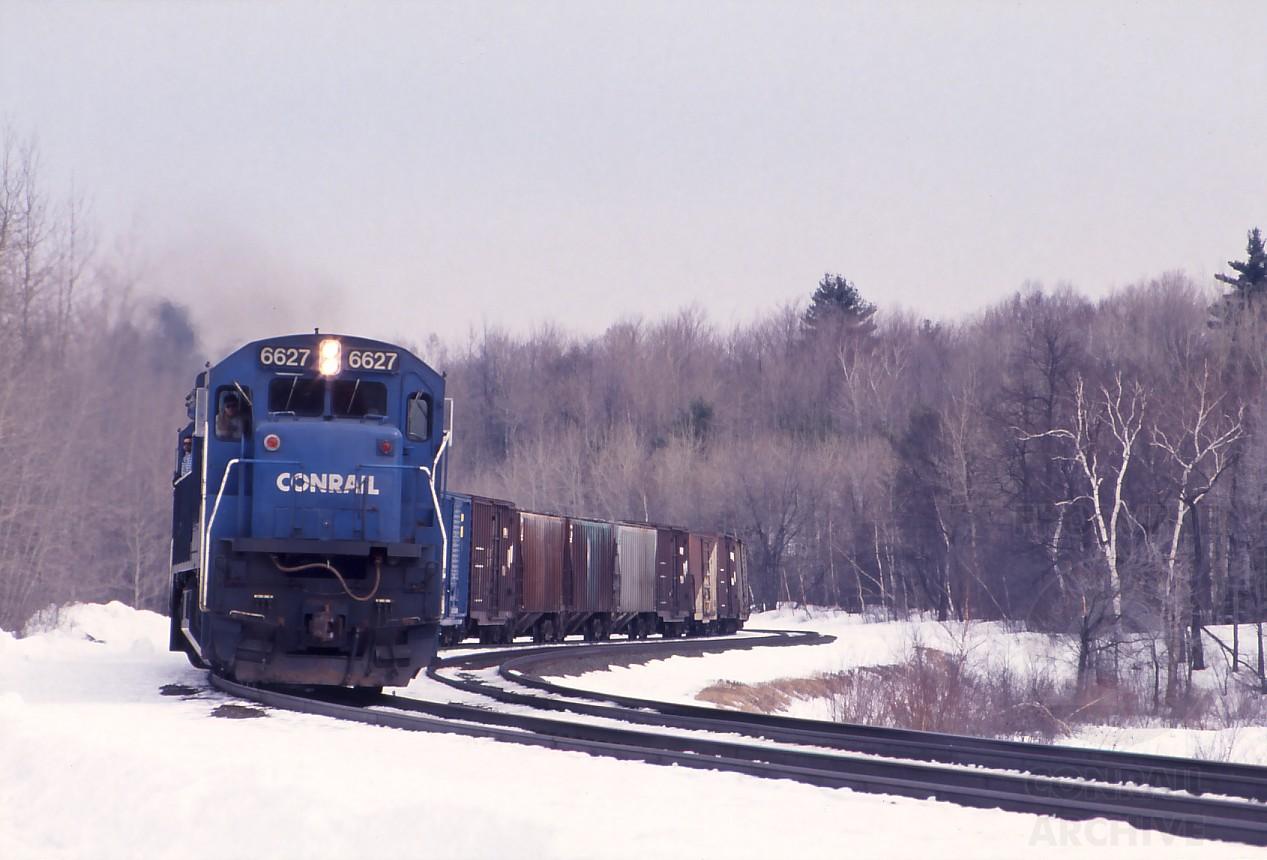 SENA, with the 6627 leading, wheels through the reverse curve along Muddy Pond in Washington, MA. on March 20, 1993.