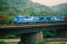 Conrail C36-7s Nos 6623 and 6629 are shoving hard on a westbound coal train passing over CSX mains at Beaver Falls, PA, in August 1995. Doug Davidson photo with permission
