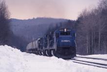 C36-7 6631 leads a tardy TV13 through Ballou's in Washington, MA. at 07:26 on March 20, 1993.