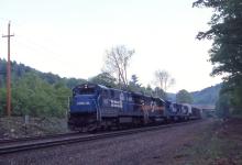 CR 6637 leads SEBO past MP 127 at 06:58 in Chester, MA. on May 22, 1993. MEC SD40 601 is working off horsepower hours owed to CR by GTI.