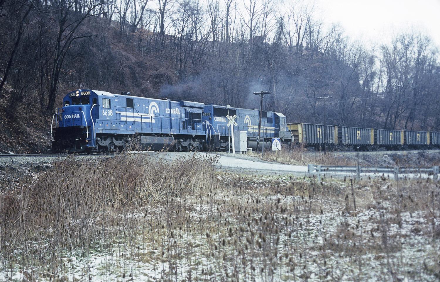 Extra CR 6638 South.... C30-7a 6638 and SD50 6768 power a Somerset Railway MTY south on the Monongahela Railroad @ Besco, Pa 2/18/90