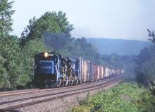 A pair of NS "Black ponies" assist CR 6638 with an NASE-X on the flats in Hinsdale, MA. on July 24, 1993.