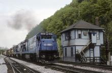 Although it looks like a post split scene, it's 1995 in this shot of a pair of Conrail C36-7's passing HO tower in Handcock, Maryland on CSX train R343. While this is still a mainline for CSX, the tower is gone as are the C36-7's.....not to mention Conrail itself.