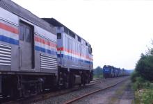NHSE4Y has his train back together and sits on track 1 pumping air as waits for Amtrak 448, the Boston section of the "Late Shore Ltd." to pass on track 2.