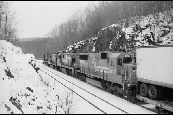 SD45-2 6657 leads SEBO-B past the hot box detectors near MP 123 in Chester, MA. on June 30, 1984. This is the present site of CP 123, with double track extending westward to CP 150 in Pittsfield and single track eastward to CP 109 in Westfield. The hot box detectors were removed at the time of the conversion to single track.