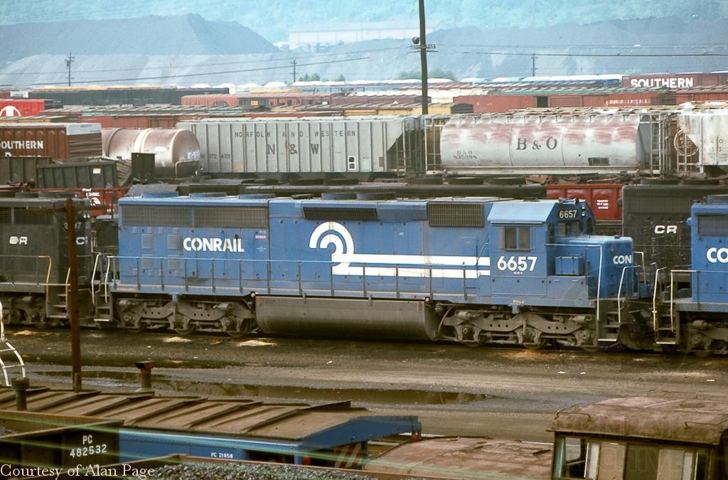 CR SD45-2 6657 (ex-EL 3672) waits for assignment at Conway yard in August, 1977.