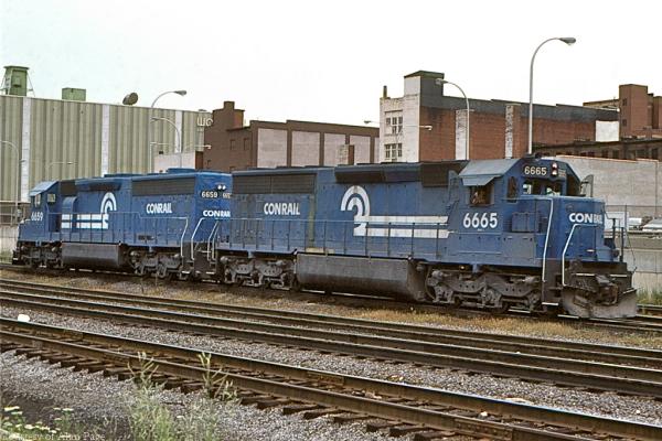 CR SD45-2 6658 (ex-EL 3673) and SD40-2 6369 (1977-built) push hard up Horseshoe in July, 1978.