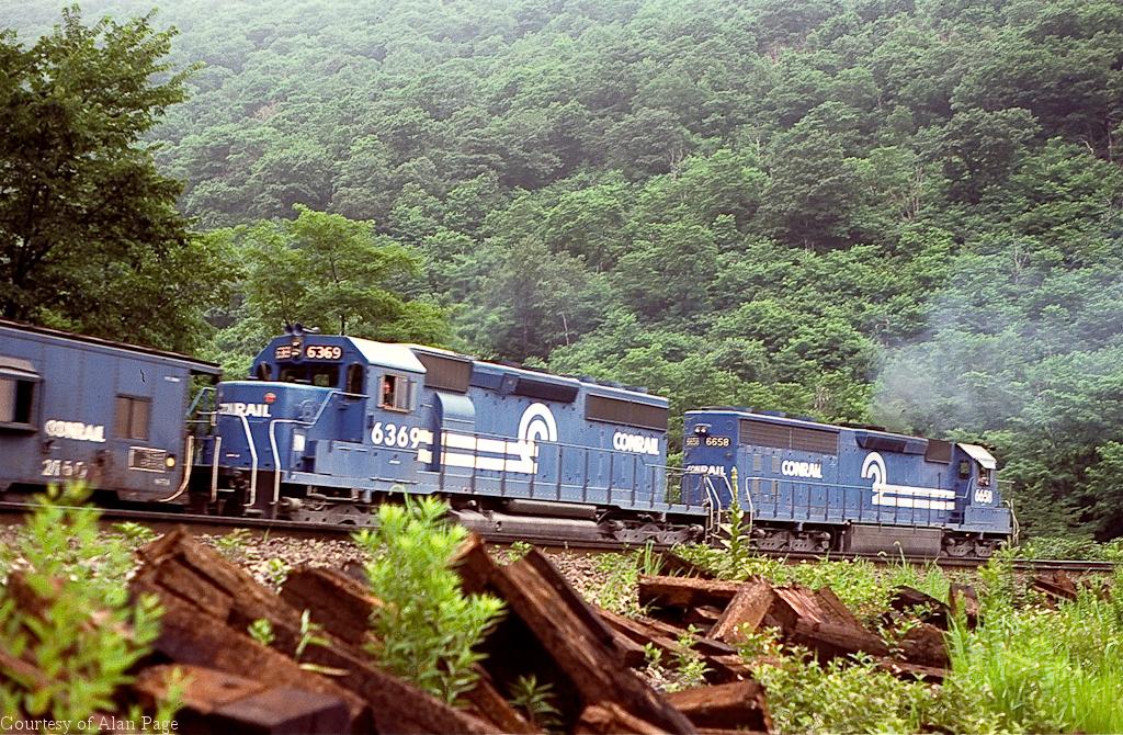 CR SD40-2 6369 (1977-built) and SD45-2 6658 (ex-EL 3673) push hard up the Curve in July, 1978.