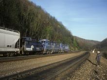 Conrail's newest were up front, but here some veteran SD45-2s push on a much older N5 class caboose. These N5s were built for the Pennsy in the first half of the century, and you can only guess how many times this car has been around the curve.
