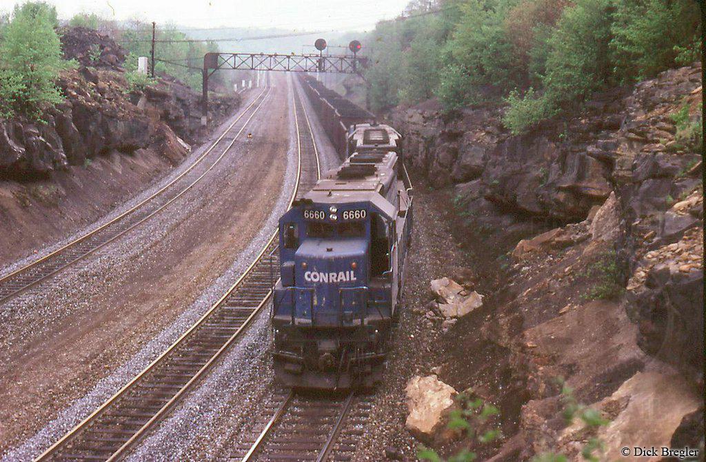 Conrail SD45-2 6660 (ex-EL 3675) is seen shoving an empty coal train west past Bennington Curve in 1982.