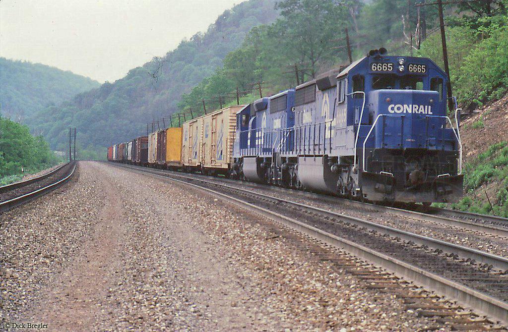 Conrail SD45-2 6665 is seen bringing up the rear of a westbound freight just east of Horseshoe Curve in 1986.
