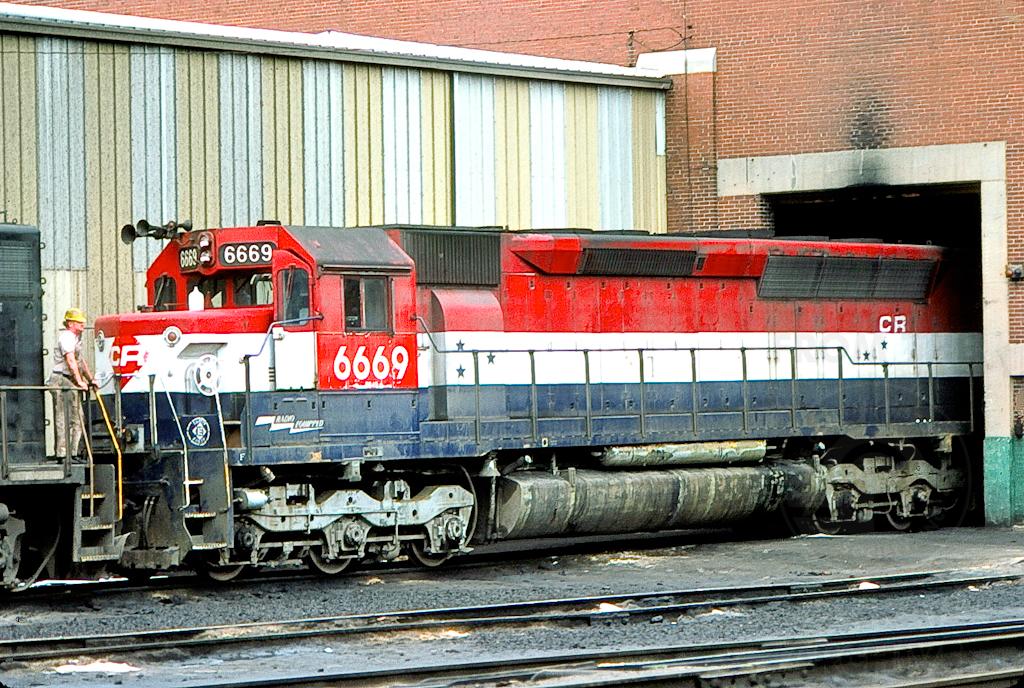CR SDP-45 6669 (ex-EL 3638), still in EL Bicentennial colors, at Enola in May, 1977. Unit 3638 was one of EL's 3635-3653 EMD order in 1969, when EL was under control of N&W. These units were returned to Norfolk Southern in 1984.