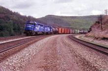 Conrail SDP45 6690 (ex-EL 3659) has just crossed the Little Conemaugh River west of South Fork, PA in 1984.