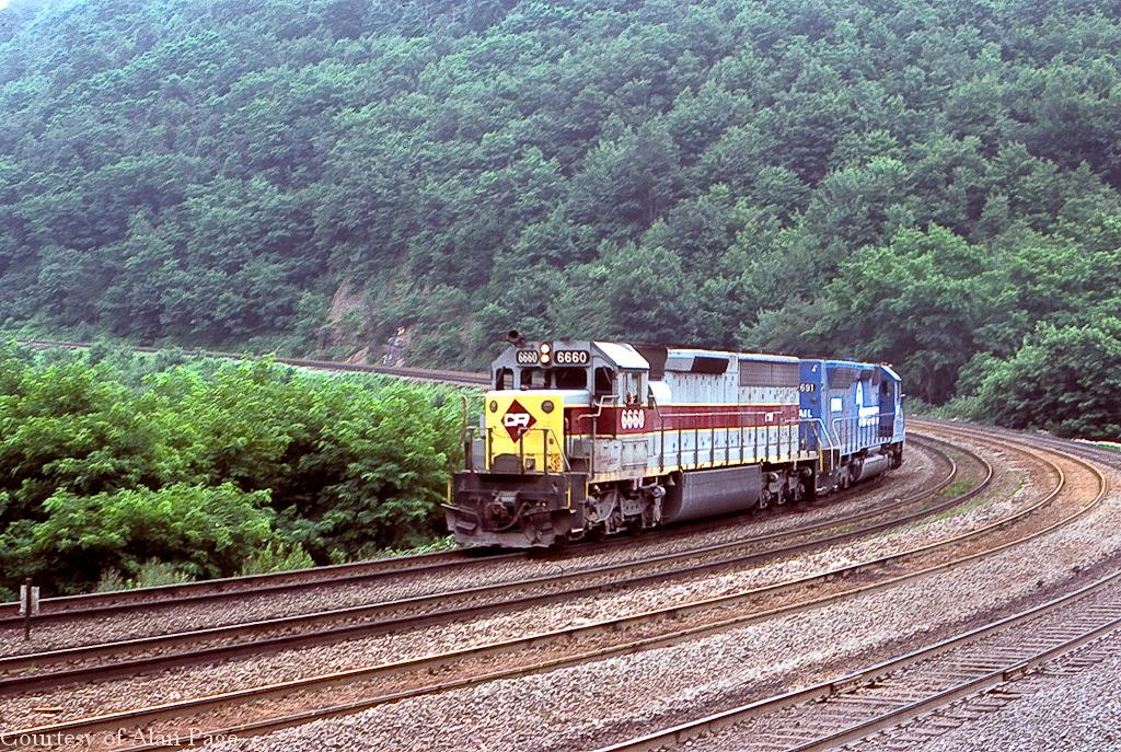 CR 6660 (ex-EL 3675) and SDP-45 6691 (ex-EL 3660) run light down the hill to begin their next pushing operation.